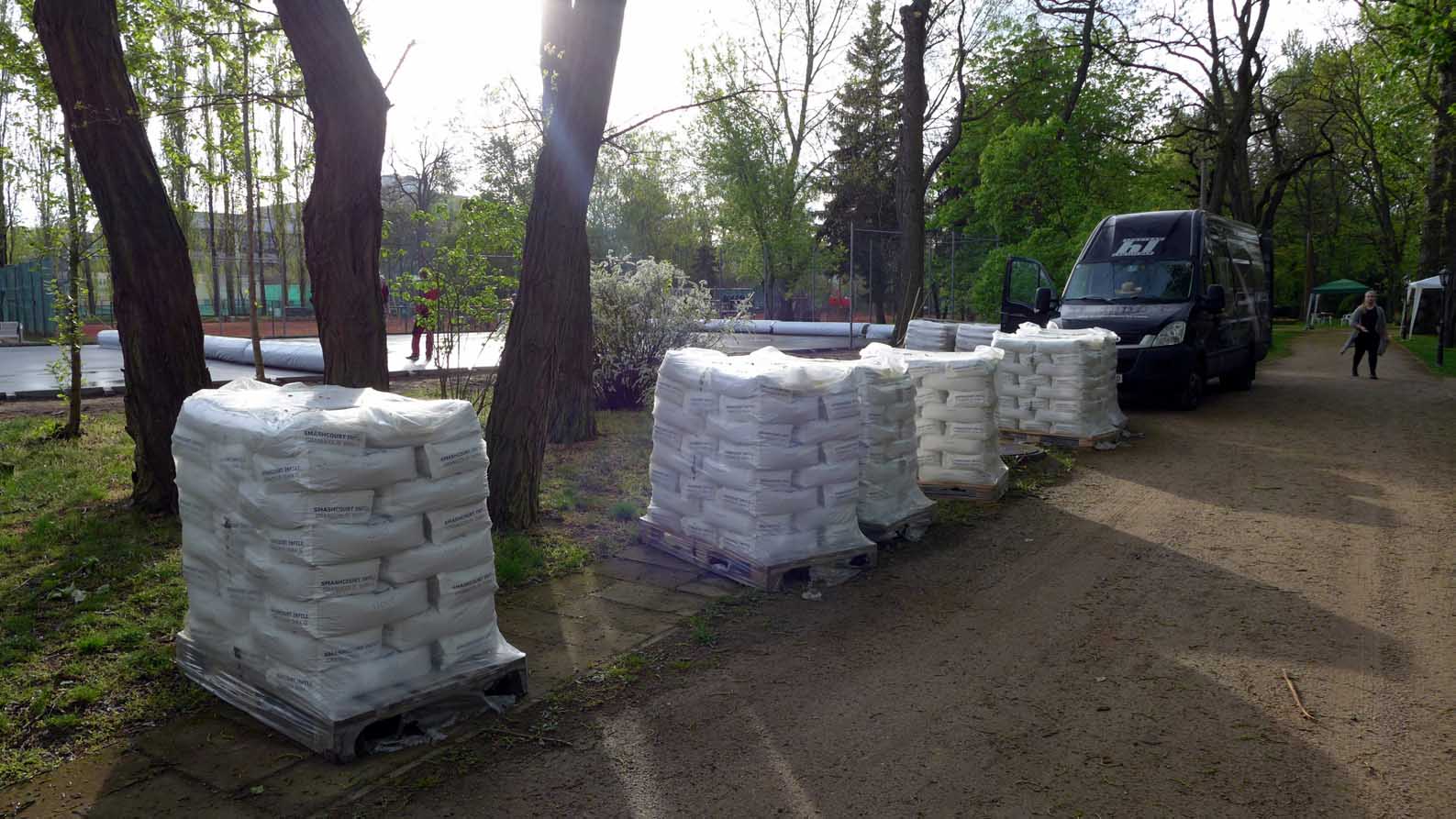 Nächster Schritt: Das Material für den Kunstrasen ist angeliefert.
