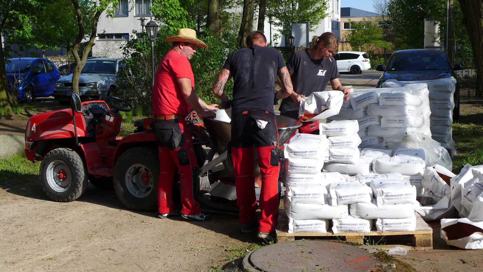 12 Tonnen Spezialsand werden Sack für Sack in das Streufahrzeug eingefüllt...